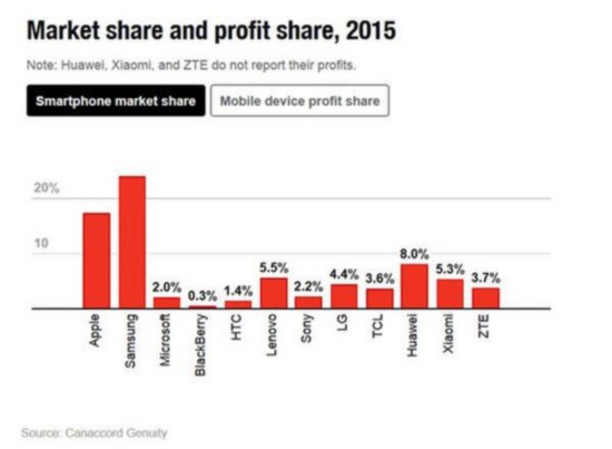 三星和蘋果兩家公司的利潤總和達到105%,造成這種情況的主要原因是其他手機制造企業在2015年度的運營情況並不理想,其中微軟的利潤相當于整個產業利潤的3%,TCL(阿爾卡特)、LG、黑莓三家企業保持了盈虧平衡,聯想(摩托羅拉)、索尼和HTC虧損額度相當于整個產業利潤的1%。