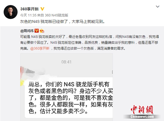 從微博上簡短有力的發文風格來看,李開新顯然是一位沉穩內斂的實幹家。在周鴻祎應消費者需求,發出為360N4S驍龍版增加灰色配色的聲音時,李開新以一句“灰色的N4S驍龍版已經做了,大家馬上就能見到”做了回應。短短一句話,既揭開了360手機新任掌舵人的神秘面紗,也展現出李開新和360手機對消費者需求的重視。