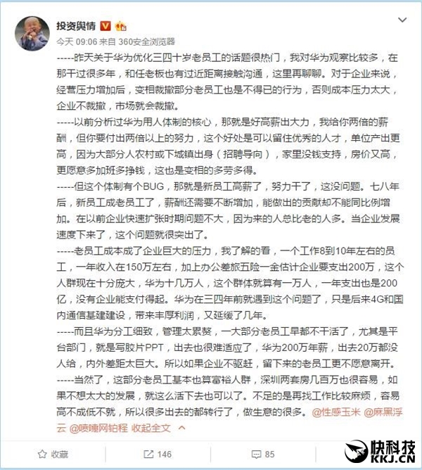自稱觀察華為多年,並在華為工作多年的微博大V@投資輿情認為,對于企業來說,經營壓力增加後,變相裁撤部分老員工也是不得已的行為,否則成本壓力太大,企業不裁撤,市場就會裁撤。老員工不斷增加的薪酬給華為帶來巨大的成本壓力,另外內部的分工細致管理太累贅也讓一大部分老員工相比新員工來說,缺乏幹勁。