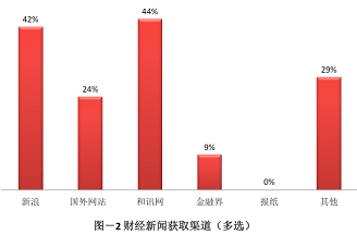 而對于“在哪里瀏覽財經新聞”這個問題,大三學生青睞的媒體是和訊網、新浪網,佔比分別高達44%和42%。這可能和這兩家網站財經新聞的報道廣度、深度、速度及貼近95後大學生的興趣品味直接相關。24%的大三學生選擇了通過國外網站來獲取信息,但幾乎沒有大三學生選擇紙媒。