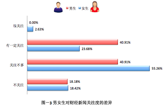 對于“你平時關注財經新聞嗎”的問題,“有一定關注”的男生比例(40.91%)遠遠高于女生(23.68%),總體上,男生比女生更關注財經新聞。