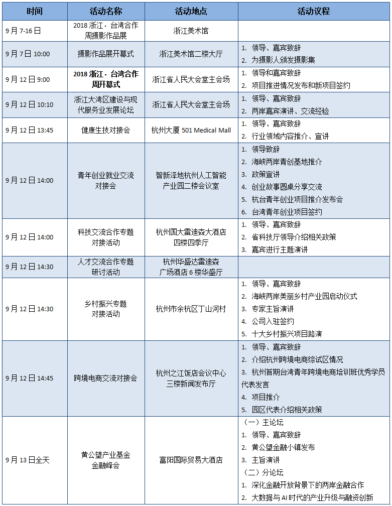 3、9月12日下午,金華市舉辦金華—臺灣經貿合作暨金義都市區專題推介會;9月14日,紹興市、麗水市分別舉辦兩岸現代農業產業合作推進會、建設大花園﹒麗臺農旅融合發展高峰論壇。