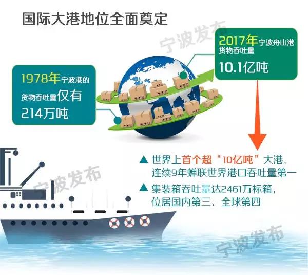 改革開放40年來,在黨中央國務院、浙江省委省政府的正確領導和大力支持下,寧波以改革開放為動力,解放思想,銳意進取,用足用好港口這一最大資源和開放這一最大優勢,堅定不移實施“以港興市、以市促港”發展戰略,經濟社會保持持續快速健康發展,實現了從內河小港向國際大港、從商埠小城向現代化國際港城的偉大跨越與華麗蛻變。