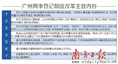 2日,廣州市舉行全面實施商事登記制度改革新聞發布會,廣州市副市長貢兒珍稱,廣州市自去年9月開展商事登記制度改革試點以來,前置審批事項縮減82%,企業申領營業執照的時間由15個工作日縮短至3個工作日,最快可在申辦當天領到營業執照。