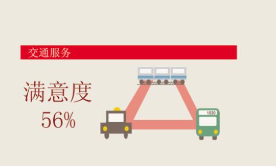 在關乎社會服務狀況的各方面,大多數居民表示滿意。其中,“交通服務”和“市容衛生”連續兩年均獲受訪者好評,本年表示“滿意”和“比較滿意”的合計比例分別為56%和55%,“不滿意”和“不太滿意”的合計比例均不過兩成。