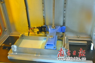 ↑一臺注滿白色樹脂原材料的3D打印設備,正在作業中。
