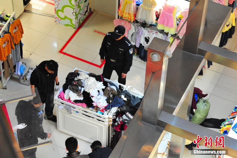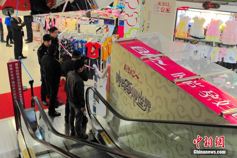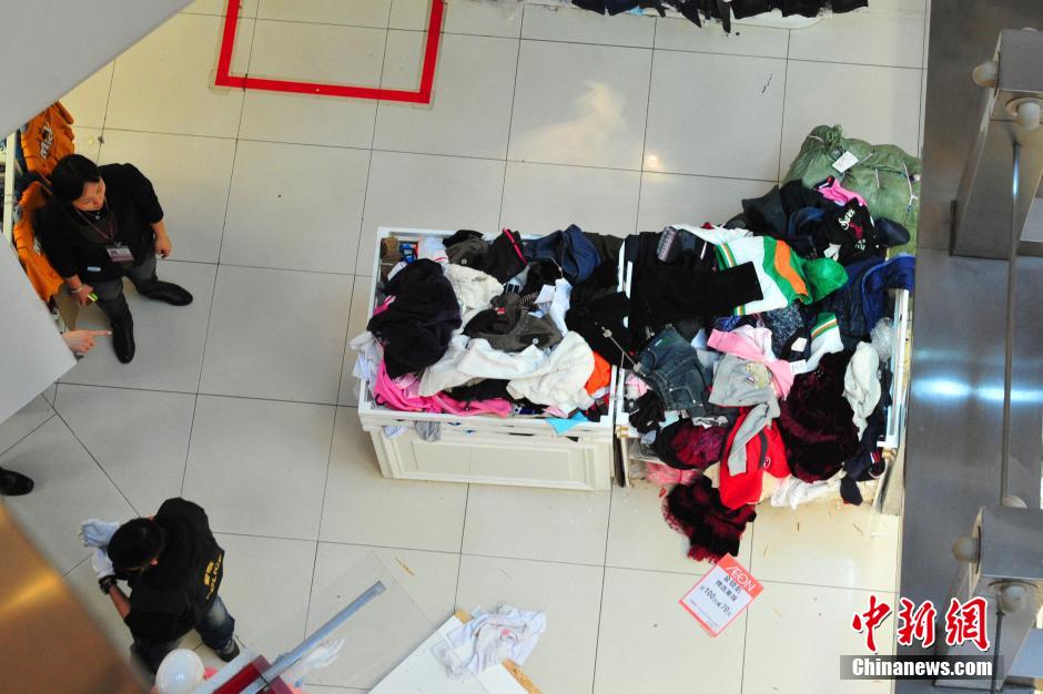 3月10日,案發現場被警方封鎖。當日下午,廣州天河城百貨發生墜樓事件,墜樓者掉到負一層童裝區的一貨架上,隨後被趕到的醫護人員抬走。中新社發 陳驥旻 攝