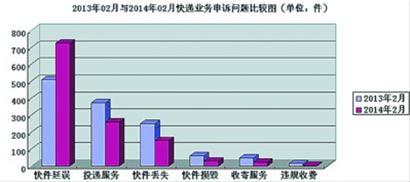 2014年02月比2013年02月的快件延誤增加了215件,投遞服務減少了112件,快件丟失減少了100件,快件損毀增加了32件,收寄服務減少了26件,違規收費減少了11件。