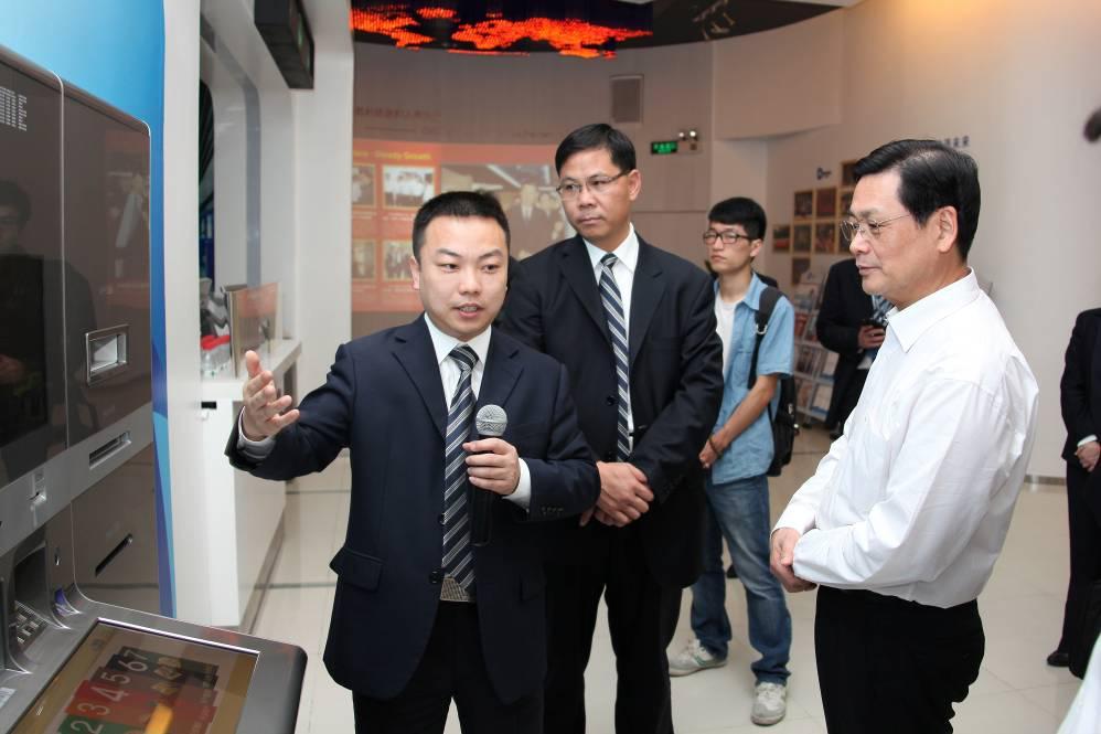 在企業的新產品展廳,陳雲賢副省長一行了解了廣電運通及其母公司廣州無線電集團的成長歷史、產業布局、產品開發、市場服務、創新研發等情況,並逐一觀摩了係列金融自助設備及解決方案、自動售票設備、遠程視頻銀行及其解決方案。參觀期間,陳副省長詳細詢問了廣電運通國內外市場佔比、與競爭對手對比的優劣勢以及知識產權保護等方面的情況,羅攀峰副總經理一一作答。羅副總介紹,廣電運通自主鈔票識別處理技術被工信部認定達到世界領先水平,廣電運通的研發投入比、研發人員數量、所掌握的專利技術數量上多年來一直位居業界前茅。