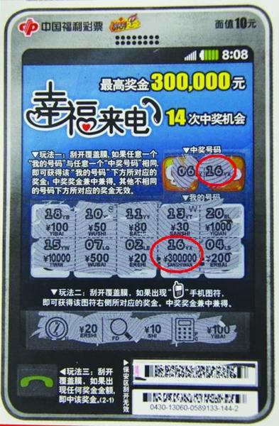 “幸福來電”以手機為專題,兩個票面為同款不同色的智能手機圖。彩票玩法區與手機功能區緊密結合,三個玩法分別對應不同的手機按鍵,二者結合可謂恰到好處。該彩票面值10元,頭獎30萬元,獎級11級,共有14次中獎機會。本彩票共有三個玩法,三個玩法區內的中獎獎金兼中兼得。玩法一:刮開覆蓋膜,如果任意一個“我的號碼”與任意一個“中獎號碼”相同,即可獲得該“我的號碼”下方所對應的獎金,中獎獎金兼中兼得;其他不相同的號碼下方所對應的獎金無效。玩法二:刮開覆蓋膜,如果出現手機圖符,即可獲得該圖符右側所對應的獎金。中獎獎金兼中兼得。玩法三:刮開覆蓋膜,如果出現任何獎金金額,即中該獎金。