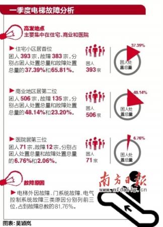 南方日報訊 (記者/昌道勵)今年一季度電梯困人事件日均12宗,近5成發生在商業區。廣州市電梯安全運行監控中心日前發布電梯安全狀況簡報,今年第一季度廣州共發生電梯困人事件1051宗,故障事件582宗。