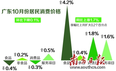 與上月相比,10月份廣東居民消費價格總水平下降0.1%,其中,食品價格下降0.4%,非食品價格上漲0.2%;消費品價格下降0.3%,服務項目價格上漲0.5%。