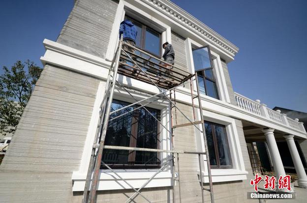 1月19日,工人正在3D打印別墅外部進行施工。 中新社發王思哲攝