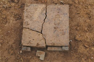 從現場的情況看,顯然這些已經暴露的古墓葬還沒有引起當地文保部門的注意。如果接下來繼續施工,很可能就要對古墓造成進一步的破壞。事實上,遭受同樣威脅的古墓還不止這一處。1月27日,在小學附近這處工地大約幾百米遠的地方,方青松還發現了2座遭到破壞更為嚴重的古墓。地面上有很多青磚裸露了出來,有的已經破碎了。破碎的磚塊上有蓮花紋,符合南朝墓磚的樣式,形狀呈楔形,應該是墓室的卷頂部分,也就是墓砌在頂上那部分上的。