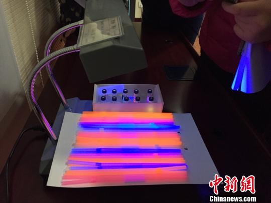 圖為正在對吸管進行熒光實驗。 楊顏慈 攝