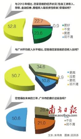 經濟政策也對居民的消費生活產生明顯影響。絕大部分居民已經感受到物價上漲帶來的壓力,有76.6%的居民認為明年的物價還會上升,居民的通漲預期在繼續,但持有這一看法的居民的比例跟上年相比有下降(下降12.2%)。由于國家對房地產採取持續穩定控制上漲的調控政策,在2014年,認為未來三年廣州房價會上漲的比例已經由2013年的66.8%降至了50.6%;認為不會上漲的比例由2013年的13.4%升至28.4%。可見,國家的房地產調控在一定程度上開始改變居民對房價上漲的預期。