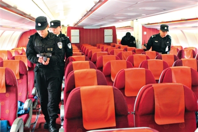 特警進入客機機艙,手持儀器進行安全檢查。武漢機場警方供圖