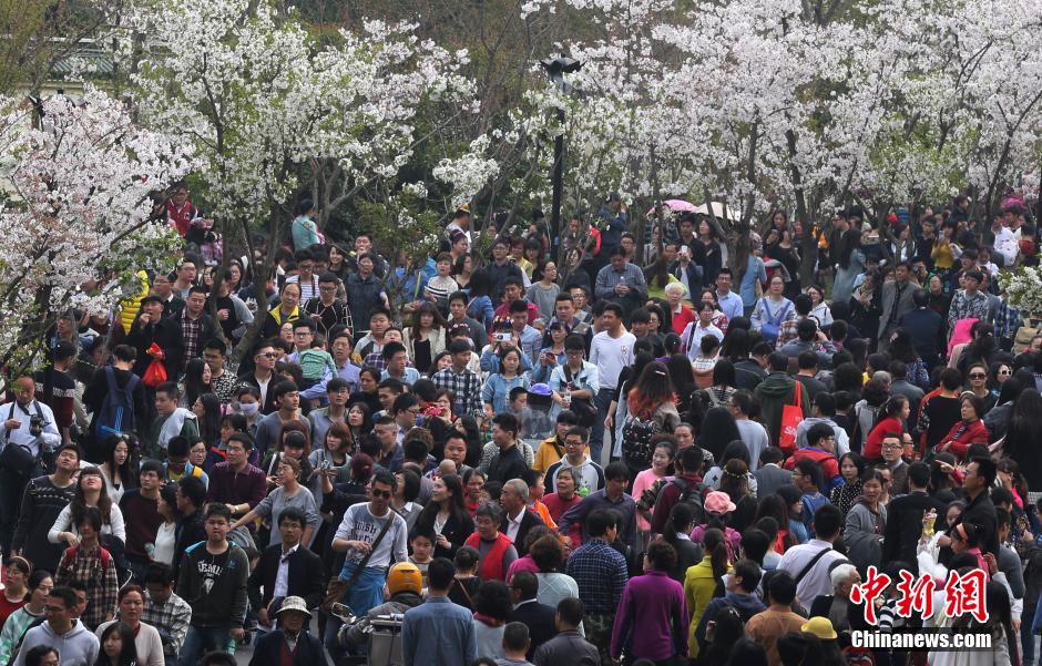 3月29日,南京雞鳴古剎門前的櫻花大道上櫻花盛開,吸引了大批市民前來踏青賞花,感受春日氣息。中新社發 泱波 攝