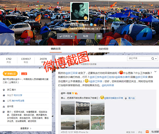 1962年出生的金中一,是政務微博界、司法界有名的微博達人,粉絲數超過130萬。在“叫板”環保部門同時,他還@了本網官微“浙江在線”,希望能夠盡快解決。
