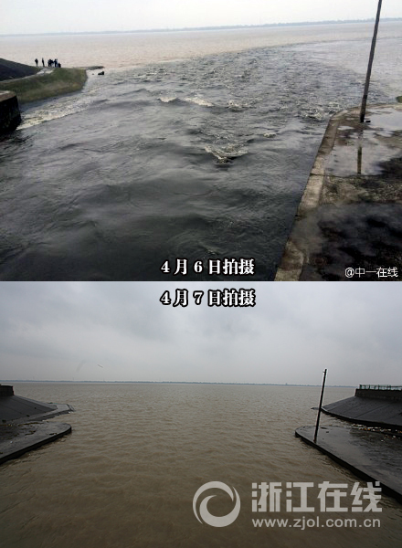 原來,金中一在錢塘江外六工段排澇閘拍下黑水直排,並上傳到微博。從他拍到的圖片中可以看出閘口江面出現了數百平米的深黑色江水,與周邊形成了鮮明對比。