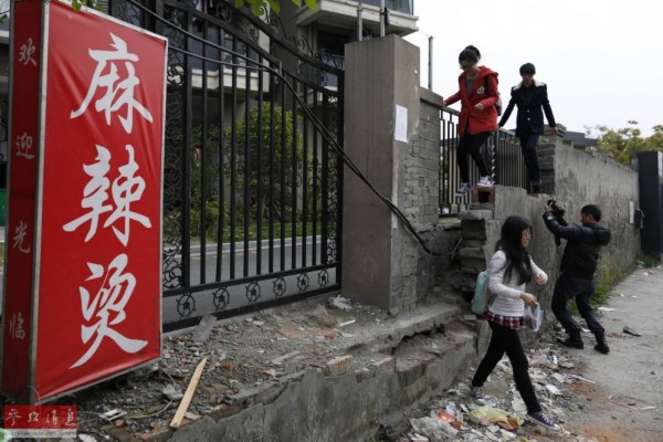 2015年04月14日,浙江省杭州市,杭州濱江區江畔雲廬小區,因為有門未開,住戶排隊爬牆出入小區。有的去附近科技園上班,有的去吃飯、買水果。據說這樣翻牆出門,比走小區大門要節省大概半個小時。這種現象已存在一年左右了。