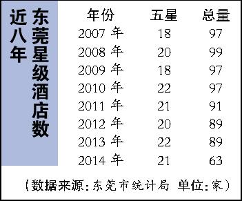 值得關注的是,據市統計局發布的數據顯示,2014年末東莞全市有星級酒店63家,其中五星級酒店21家。記者梳理發現,東莞全市星級酒店最多的時候是2008年,達到了99家。也就是說,2014年東莞星級酒店的數量要比2008年的時候減少了36家。