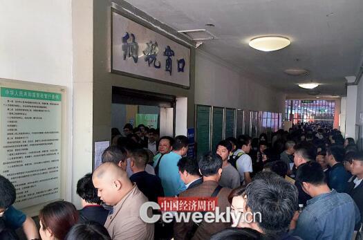 而在四樓的信息查詢窗口,排起的隊伍也已經隨著牆角一路延伸,構成了一個尾部翹起的大寫“L”形。據記者觀察,隨著時間推移,人數還在不斷增長。在領號區及交易中心預檢大廳門前排起的長隊一眼望不到盡頭,記者從隊首走到隊尾,花費了半分鐘的時間。