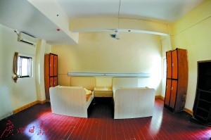 一個類似餐廳的地方擺滿了陳舊的椅子。蘇工說,將來這是老人開會的地方。往前走,就到了一個小型的西餐廳,“這里將來是老人會客的地方,家人探望的時候,就可以在這里坐著聊天”。