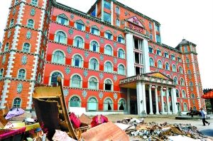 從KTV轉了一圈出來,來到酒店的主樓。主樓的後門旁幾個工人正在做一個木制的堂屋,與外面的烈日炎炎相比,里面稍顯昏暗。地面、樓道、牆壁上面,都沾滿了灰塵。