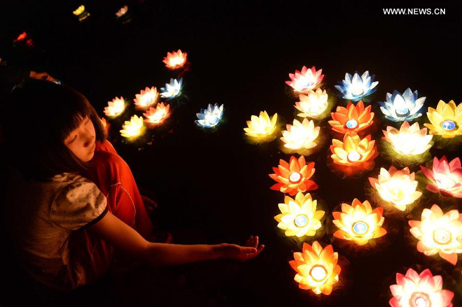 A girl floats river lanterns in a river at Wanli District of Nanchang, capital of east China's Jiangxi Province, April 1, 2015. As the Qingming Festival, or the Tomb-Sweeping Day, draws near, citizens in Nanchang floated river lanterns to mourn for their deceased family members instead of burning incense and paper money as in the past. (Xinhua/Chen Zixia)