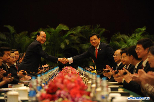 Chen Deming (R), president of the mainland-based Association for Relations Across the Taiwan Straits (ARATS), shakes hands with Lin Join-sane, chairman of the Taiwan-based Straits Exchange Foundation (SEF), before the ninth round of cross-strait talks in Shanghai, east China, June 21, 2013. The ninth round of talks between ARATS and SEF was held here on Friday. (Xinhua/Chen Yehua)