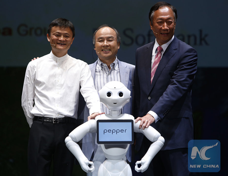 Jack Ma, or Ma Yun, Chairman of the Board of Alibaba Group, Softbank's president Masayoshi Son, and Terry Gou, founder and chairman of Foxconn, pose for photo with a humanoid robot "Pepper" during the Softbank's press conference in Chiba, near Tokyo, Japan, June 18, 2015.(Xinhua/Stringer)