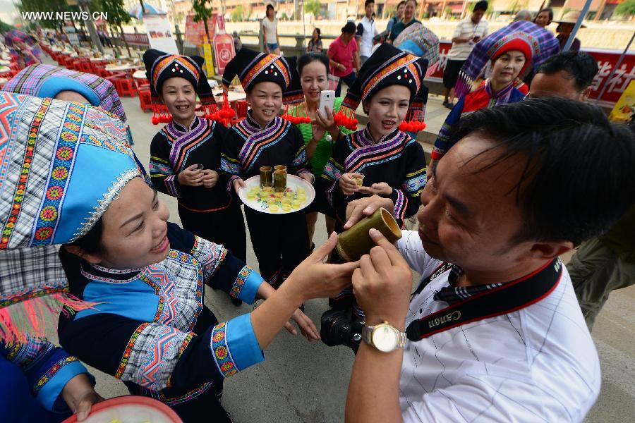 Women of the Zhuang ethnic group urge a tourist to drink at a "hundred-family banquet" in Leli Town of Baise City, south China's Guangxi Zhuang Autonomous Region, May 7, 2015. Local people of Zhuang ethnic group held "hundred-family banquets" as the highest etiquette to entertain guests. (Xinhua/Wei Wanzhong)