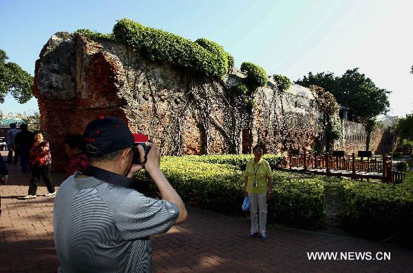 Toursits take photos in front of an ancient wall built in Dutch colonial era at Anping Fortress, a place of interet in Tainan City, southeast China's Taiwan, May 4, 2011. (Xinhua/Gong Bing)