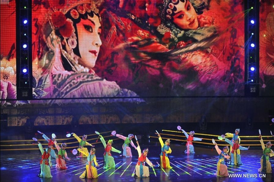 Photo taken on Aug. 24, 2013 shows a dancing performance during the 2013 Hakka folk song TV show in Hsin-chu, southeast China's Taiwan. The TV show, which has been held since four years ago, becomes a Hakka culture exchange bridge across the Taiwan Strait. (Xinhua/Lu Peng)