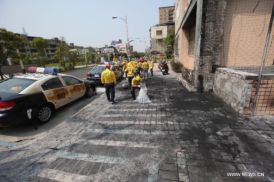 Staff members clear off the site of fire at the parking lot of Songshan Police Station in Taipei, southeast China's Taiwan, March 18, 2015. The fire, which is suspected to be arson, burnt down 11 police motorcycles and two police cars in front of the police station on Wednesday morning. Investigation is underway. (Xinhua/Jin Liwang)