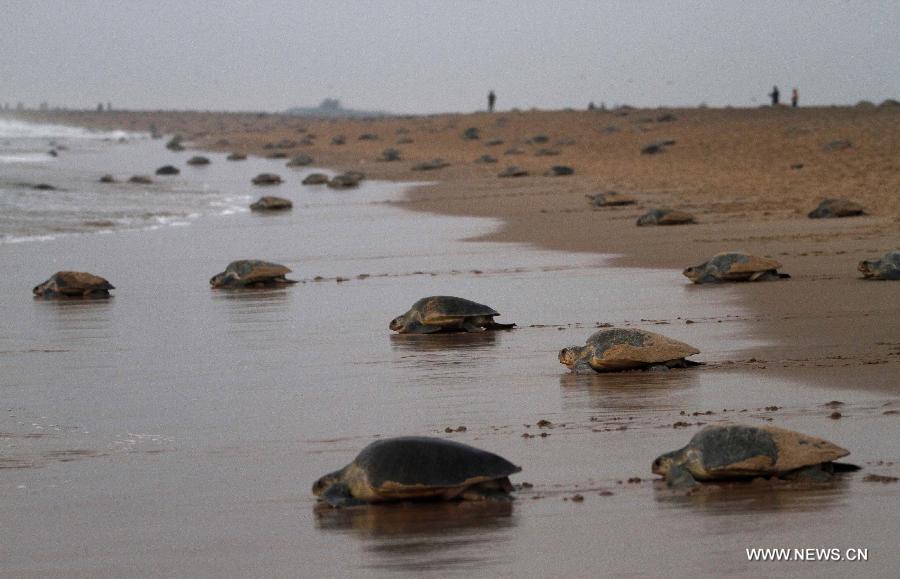 Olive Ridley turtle crawl towards the Bay of Bengal Sea after laying eggs at the mouth of Rushikulya River, around 150 km away from the eastern Indian state Orissa's capital Bhubaneswar, March 13, 2015. (Xinhua/Stringer)