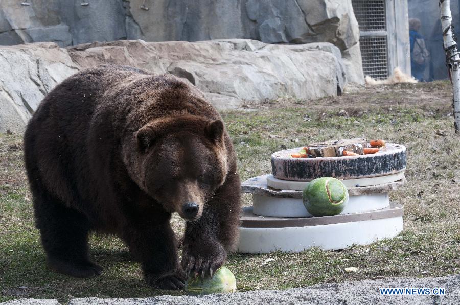 One of a pair of grizzly bears enjoys himself with food on his 20-year-old birthday party at the Brookfield Zoo, west suburb of Chicago, the United States, on March 21, 2015. The grizzly bears, named Jim and Axhi, turn to be 20 on Saturday and the zoo officials celebrated their birthday with a special party. The bear brothers were born on the same day and made their way to the zoo in 1995 when they were orphaned in Alaska, and they have lived in the Brookfield zoo ever since. (Xinhua/He Xianfeng)