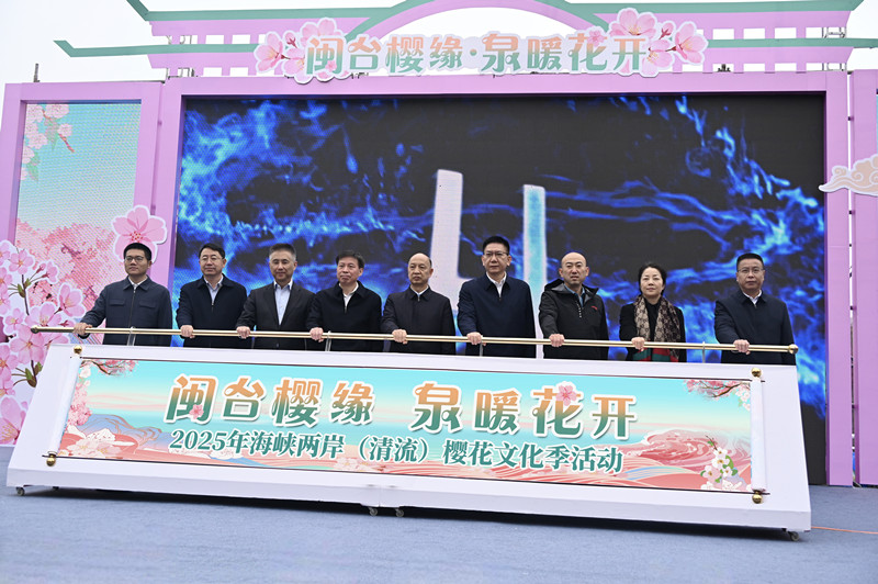 2月21日,在精彩紛呈的文藝表演中,2025年海峽兩岸(清流)櫻花文化季在清流賴坊櫻花園隆重開幕。全國臺聯會長鄭建閩、全國臺聯聯絡部部長任揮、福建省臺聯黨組書記劉良輝、上海市臺聯黨組書記李海泳、福建省海外聯誼會副會長李文慎、福建省臺辦副主任翁雲萍、三明市海外聯誼會會長黃冠華、清流縣委書記吳鐘民、清流縣縣長莫彩華、三明市臺辦主任朱昶凱、三明市臺聯會長沈傑等出席開幕式。