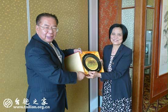 建省臺聯柯連妹副會長(右)與臺灣領隊盧孝治先生互贈紀念品 鄭嵐/攝影