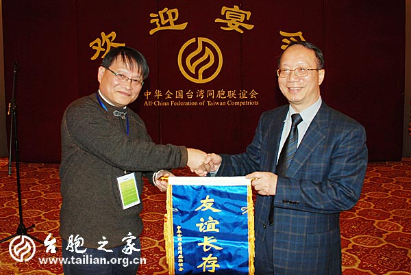 全國臺聯副會長、福建省臺聯會長陳耀中與參訪團團長楊志誠交換紀念品