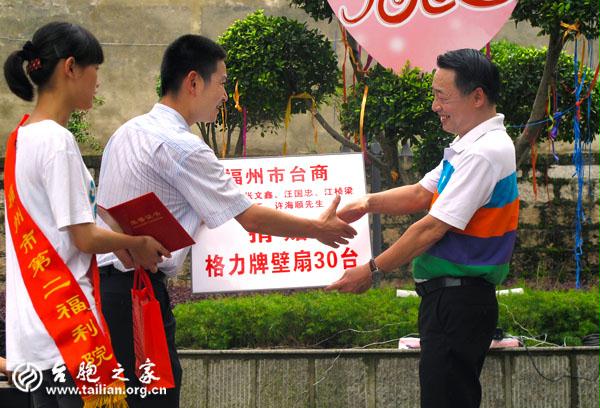 福州市第二福利院因為近期房舍要進行翻新修建,院內的老人孩子只能搬到臨時板房中居住。炎炎夏日即將到來,這麼熱的天氣防暑降溫怎麼辦?省臺聯志願者服務隊了解這一情況後,心中十分著急並積極幫助聯係解決。省臺聯名譽理事臺商洪哲隆先生表示,福利院的老人孩子確實需要幫助,我們臺商也要為他們做一些事情!隨即,洪哲隆先生與在榕臺商張文鑫、汪國忠、江楨梁、朱家玉、許海順先生共同捐贈挂扇三十臺,解了福利院的燃眉之急。