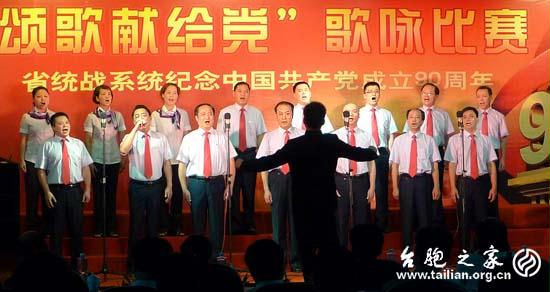 臺胞之家網訊:為隆重紀念中國共產黨成立90周年,6月24日下午,福建省統戰係統“頌歌獻給黨”歌咏比賽在“同心樓”舉辦。省政協副主席、省委統戰部長張燮飛、副部長翁卡,省社會主義學院、各民主黨派、有關人民團體機關負責人與上述單位組成的14支代表隊齊集一堂,用心聲唱出對黨的一片深情和對祖國母親的熱愛。