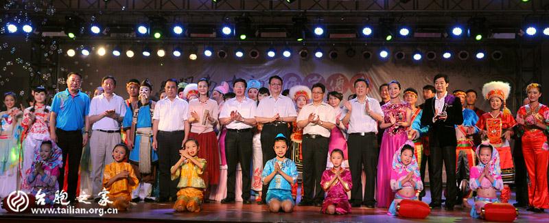 全國臺聯會長汪毅夫等領導登臺向演員表示祝賀並與演職人員合影 鄭嵐/攝影