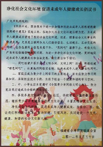 福建省臺聯發出“凈化社會文化環境 促進未成年人健康健康成長”倡議書
