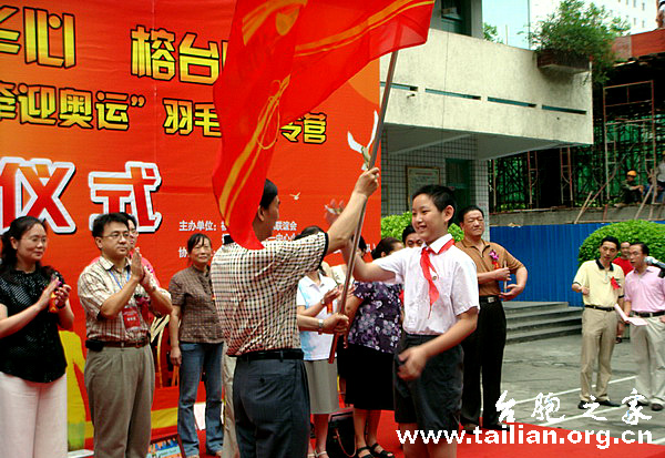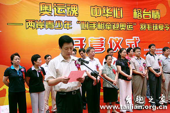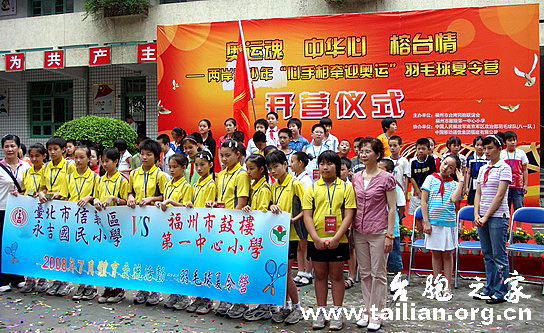 7月8日上午,在距北京奧運會開幕還剩整整一個月之際,由福州市臺聯主辦、以“心手相牽迎奧運”為主題的海峽兩岸青少年羽毛球夏令營在福州正式拉開序幕。來自臺北市永吉國小的18名愛好羽毛球的師生和福州市鼓一小的師生一起參加了此次羽毛球夏令營活動。