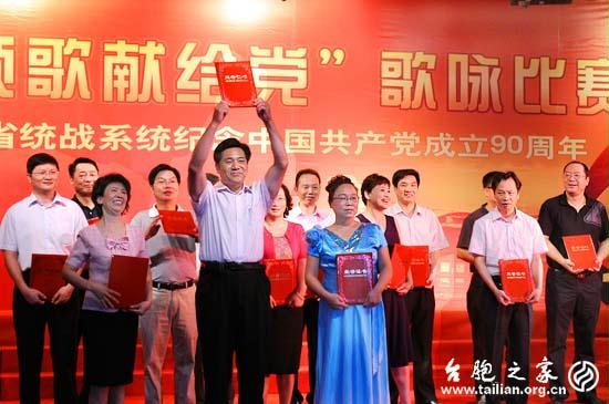 臺胞之家網訊:為隆重紀念中國共產黨成立90周年,6月24日下午,福建省統戰係統“頌歌獻給黨”歌咏比賽在“同心樓”舉辦。省政協副主席、省委統戰部長張燮飛、副部長翁卡,省社會主義學院、各民主黨派、有關人民團體機關負責人與上述單位組成的14支代表隊齊集一堂,用心聲唱出對黨的一片深情和對祖國母親的熱愛。