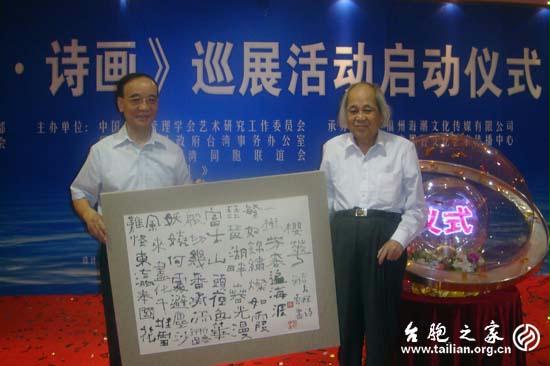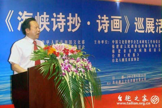 啟動儀式上,福建省臺辦副主任、福建省臺聯黨組書記蔡爾申代表主辦單位致辭。他首先向關心支持巡展活動的國家文化部、全國臺聯等有關部門和領導以及社會各界人士表示衷心的感謝,對前來出席啟動儀式的領導和嘉賓表示熱烈的歡迎。他指出,中國是詩歌大國、書畫大國,詩歌與書畫是中華民族悠久文化的精華和瑰寶。自古以來,海峽兩岸涌現出許多愛國愛鄉的詩人、書法家及美術家。他們膾炙人口、美輪美奐的詩歌、書畫作品,融思想性于藝術性之中,是兩岸民族文化向心力及凝聚力的精髓所在。這些作品,不但能體現海峽兩岸同胞愛國愛鄉的赤子情懷,而且影響海峽兩岸文化層面的行為導向、態度視角和情趣意向。高層次、高品位的書畫藝術文化交流,能培養和推介海峽兩岸文化藝術人才,加強海峽兩岸文化藝術間的交流合作,增進海峽兩岸民眾間的民族認同感和文化共識起到重要的作用。他認為,《海峽詩抄·詩畫》巡展活動將是海峽兩岸文化藝術交流的一次盛會,是一場“主題突出、內容豐富、精彩紛呈、美不勝收”的藝術視覺大餐。巡展活動順乎海峽兩岸和平發展的趨勢,情係海峽兩岸文化藝術交流交往的願景,一定會深受兩岸民眾的歡迎和喜愛,為海峽兩岸文化的大繁榮、大發展、大融合做出新的更大的貢獻。蔡書記強調,福建與臺灣地緣相近、血緣相親、文緣相承、商緣相連、法緣相循,臺灣同胞中祖籍福建的佔80%以上,在對臺交往中具有得天獨厚的優勢。福建省臺聯是福建省臺灣同胞的愛國社會團體,在當前兩岸關係出現積極變化和福建跨越發展的新形勢下,要進一步發揮與廣大臺胞的鄉情親情優勢,多形式、全方位地加強閩臺兩岸民眾間文化、教育和經貿等層面的交流與合作,“聯誼、服務、團結”廣大臺胞,增進臺灣鄉親對中華民族和中華文化的認同感,為海峽西岸經濟區建設和祖國和平統一大業建功立業。藝術研究工作委員會高級顧問、著名書法家謝雲在啟動儀式現場還捐贈了其精湛的書法藝術作品。