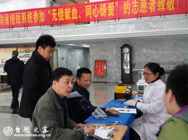 臺胞之家網福建臺聯訊:2015年2月3日,時值隆冬,但福建省民主黨派及群團辦公大樓“同心樓”大廳卻是暖意融融。福建省臺聯機關全體工作人員踴躍參加省委統戰部直屬機關工會組織的“無償獻血、同心鑄愛”志願活動,體現了臺聯人樂于奉獻愛心的高尚情懷。