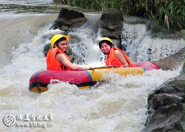福建臺胞之家網訊:全國臺聯臺胞青年千人夏令營暨2015海峽西岸臺胞青年夏令營的故事繼續在閩南發展。今天上午,天公作美,難得的陰天伴著陣陣細雨,是夏季難得一遇的漂流好天氣。100多名兩岸臺胞青年來到長泰馬洋溪,玩轉精彩刺激的橡皮舟漂流運動。這是勇敢者與青年人的項目,也是考驗勇者、智者、團隊精神的項目。在漂流教練和帶隊老師的鼓勵下,兩岸青年學子拋棄了膽怯,增添了勇氣,紛紛選好搭檔躍躍欲試。